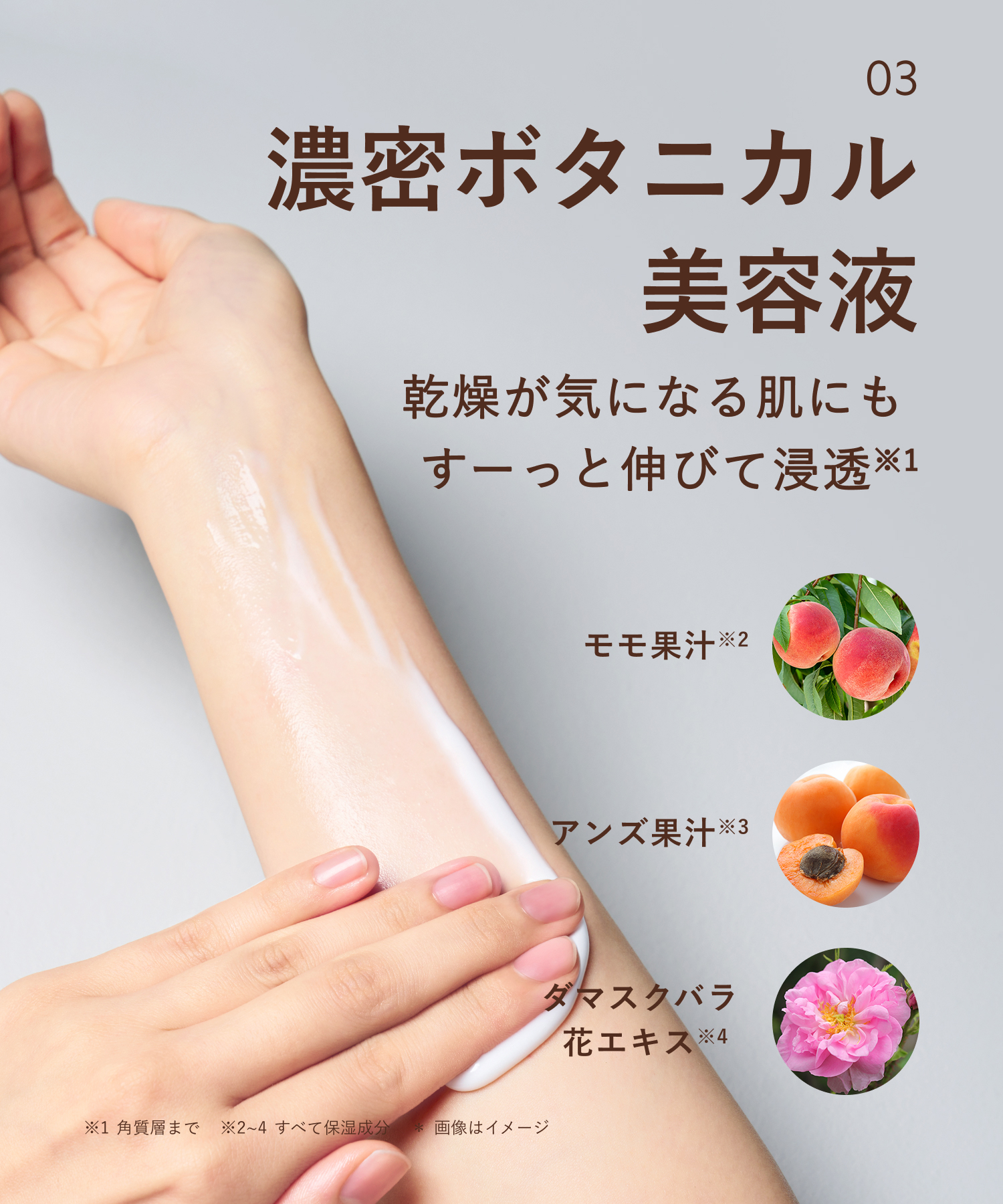 | 成分 | 水、グリセリン、プロパンジオール、トリ(カプリル酸/カプリン酸)グリセリル、ステアリン酸、グリコシルトレハロース、シア脂、カカオ脂、アストロカリウムムルムル種子脂、アーモンド油、ヤシ油、月見草油、セイヨウノコギリソウ油、アトラスシーダー木油、ニオイテンジクアオイ花油、グレープフルーツ果皮油、レモン果皮油、ロンギホレン、パチョリ油、ダマスクバラ花油、フサヌススピカツス木油、イランイラン花油、マカデミア種子油、アルガニアスピノサ核油、アンズ果汁、ダマスクバラ花エキス、アケビエキス、モモ果汁、スクワラン、加水分解水添デンプン、ミツロウ、ポリソルベート60、ソルビトール、(アクリル酸ヒドロキシエチル/アクリロイルジメチルタウリンNa)コポリマー、ジグリセリン、ダイマージリノール酸(フィトステリル/イソステアリル/セチル/ステアリル/ベヘニル)、ステアリン酸ポリグリセリル-10、ステアリン酸PEG-40、クレアチン、イノシトール、スクレロチウムガム、ラウロイルグルタミン酸ジ(フィトステリル/オクチルドデシル)、グリチルリチン酸2K、キサンタンガム、イソステアリン酸ソルビタン、ヒアルロン酸Na、PCA-Na、BG、ヒドロキシプロピルシクロデキストリン、フェノキシエタノール、メチルパラベン、プロピルパラベン |