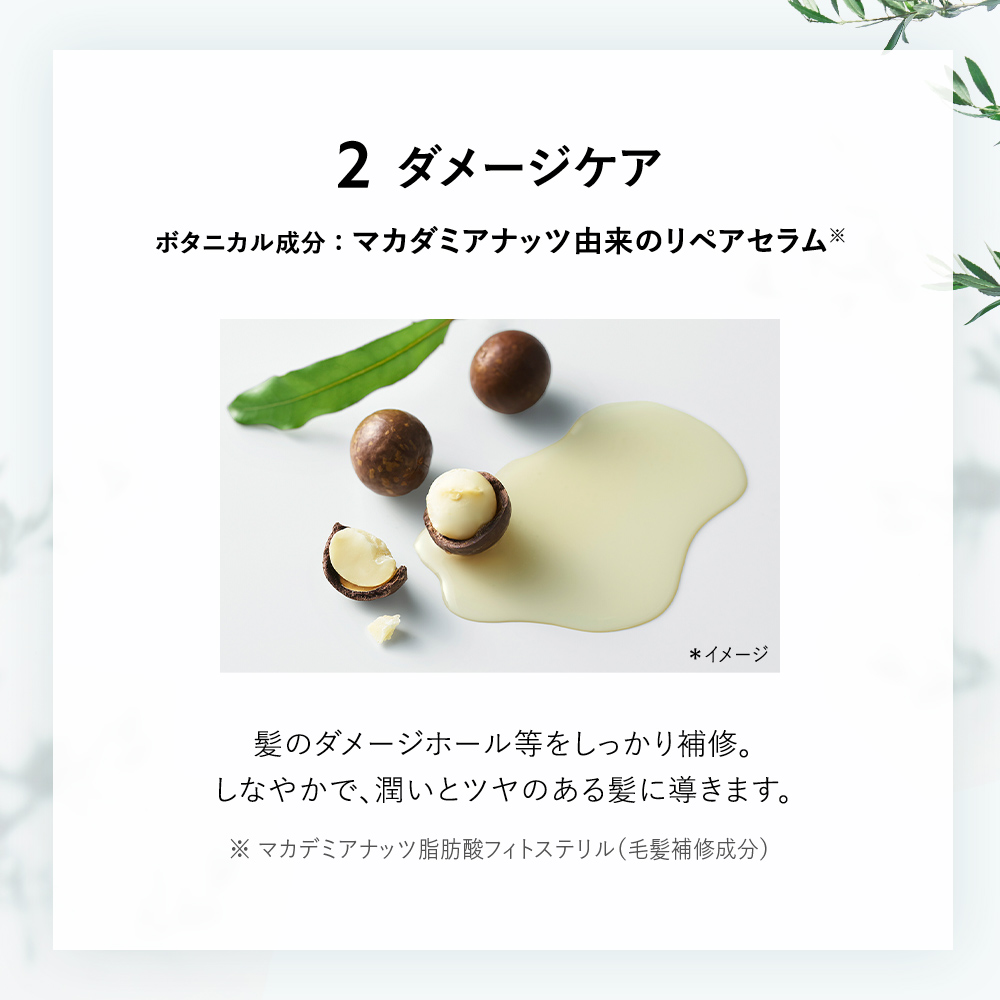 | 成分 | 水、セタノール、ステアラミドプロピルジメチルアミン、ソルビトール、グリセリン、シラカンバ樹液、ガラクトミセス/シラカンバ樹液発酵液、トウミツ、スフィンゴ糖脂質、マカデミアナッツ脂肪酸フィトステリル、加水分解野菜タンパク、グリチルリチン酸2K、ブドウ種子エキス、テルミナリアフェルジナンジアナ果実エキス、ローズマリー葉エキス、セージ葉エキス、酒粕エキス、シア脂、ヒマワリ種子油、マカデミア種子油、シャクヤク根エキス、レモン果実エキス、セイヨウアカマツ球果エキス、ホップエキス、スギナエキス、アルギニン、加水分解ケラチン(羊毛)、PEG30フィトステロール、乳酸、BG、PPG3カプリリルエーテル、オレイルアルコール、ステアリン酸グリセリル、PEG40水添ヒマシ油、水添レシチン、水添リゾレシチン、ジステアリルジモニウムクロリド、ベヘントリモニウムクロリド、フィトステロールズ、ペンチレングリコール、ヘキシレングリコール、EDTA2Na、エタノール、トコフェロール、フェノキシエタノール、安息香酸Na、香料 |