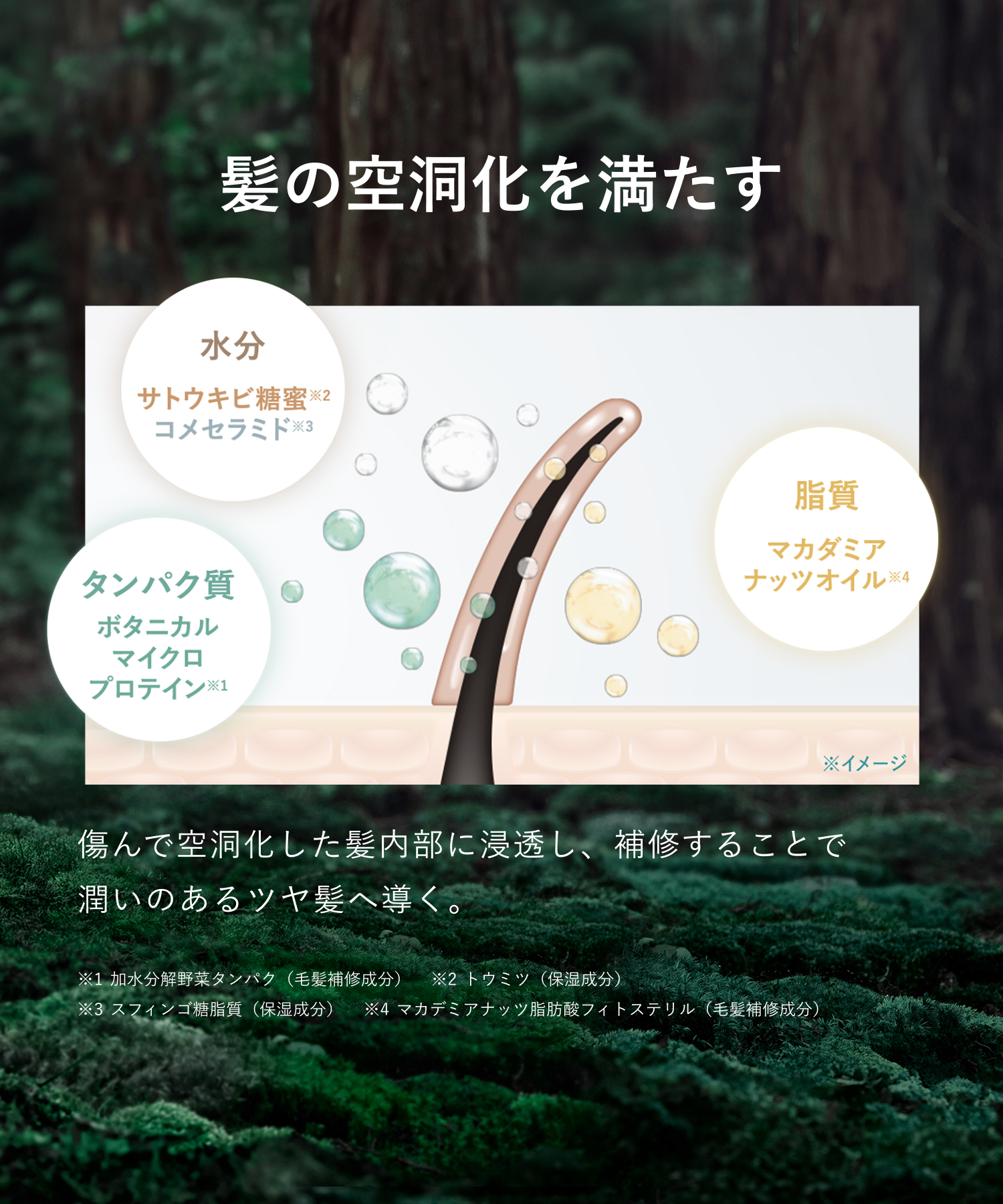 | 成分 | 水、セテアリルアルコール、ジメチコン、グリセリン、DPG、ベヘントリモニウムクロリド、アボカド油、シラカンバ樹液、ガラクトミセス/シラカンバ樹液発酵液、マカデミアナッツ脂肪酸フィトステリル、加水分解野菜タンパク、トウミツ、スフィンゴ糖脂質、グリチルリチン酸2K、ブドウ種子エキス、テルミナリアフェルジナンジアナ果実エキス、ホホバ種子油、ヨーロッパキイチゴ果実エキス、セイヨウノコギリソウ油、ベルガモット果実油、コショウ種子油、エンピツビャクシン油、コウスイガヤ油、オニサルビア油、コリアンダー果実油、ユーカリ葉油、ニオイテンジクアオイ花油、ラベンダー油、レモン果皮油、ロンギホレン、ニュウコウジュ油、オレンジ果皮油、リモネン、パルマローザ油、酒粕エキス、加水分解ヒアルロン酸、セラミドNG、加水分解ケラチン(羊毛)、アルギニン、ヒアルロン酸Na、イソアルキル(C10-40)アミドプロピルエチルジモニウムエトサルフェート、リンゴ酸、PEG-30フィトステロール、水添レシチン、フィトステロールズ、水添リゾレシチン、イソステアリン酸イソステアリル、ジリノール酸ジイソプロピル、BG、PPG-4セテス-20、PEG-40水添ヒマシ油、セタノール、ペンチレングリコール、ヘキシレングリコール、ジステアリルジモニウムクロリド、ベヘントリモニウムメトサルフェート、ステアルトリモニウムクロリド、アモジメチコン、乳酸、EDTA-2Na、エタノール、イソプロパノール、トコフェロール、安息香酸Na |