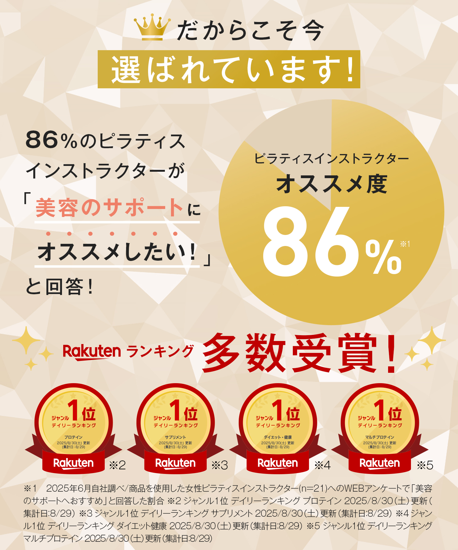 | 原材料名 | コラーゲンペプチド(ドイツ製造)、マルトデキストリン、ホエイたんぱく濃縮物、食物繊維(イヌリン)、ドロマイト、ぶどう糖、茶花エキス末、マンガン含有酵母、亜鉛含有酵母、銅含有酵母、ビタミンE含有植物油、モリブデン含有酵母、乳酸菌末(殺菌)、ヨウ素含有酵母、セレン含有酵母、クロム含有酵母/酸味料、クエン酸K、V.C、乳化剤、塩化K、甘味料(スクラロース、アセスルファムK)、香料、ピロリン酸鉄、ナイアシン、パントテン酸Ca、加工デンプン、V.A、V.B1、V.B2、V.B6、葉酸、V.D、V.B12、(一部に乳成分・大豆・ゼラチンを含む) |