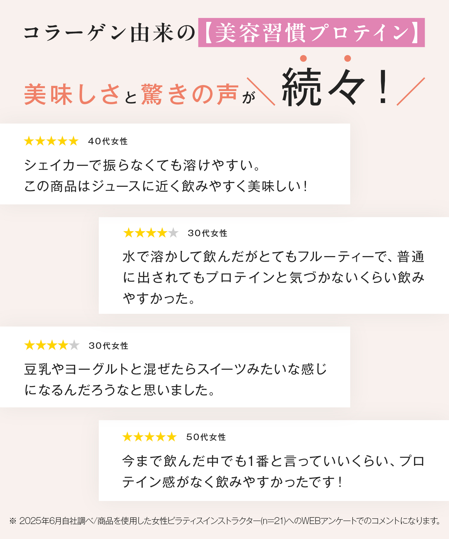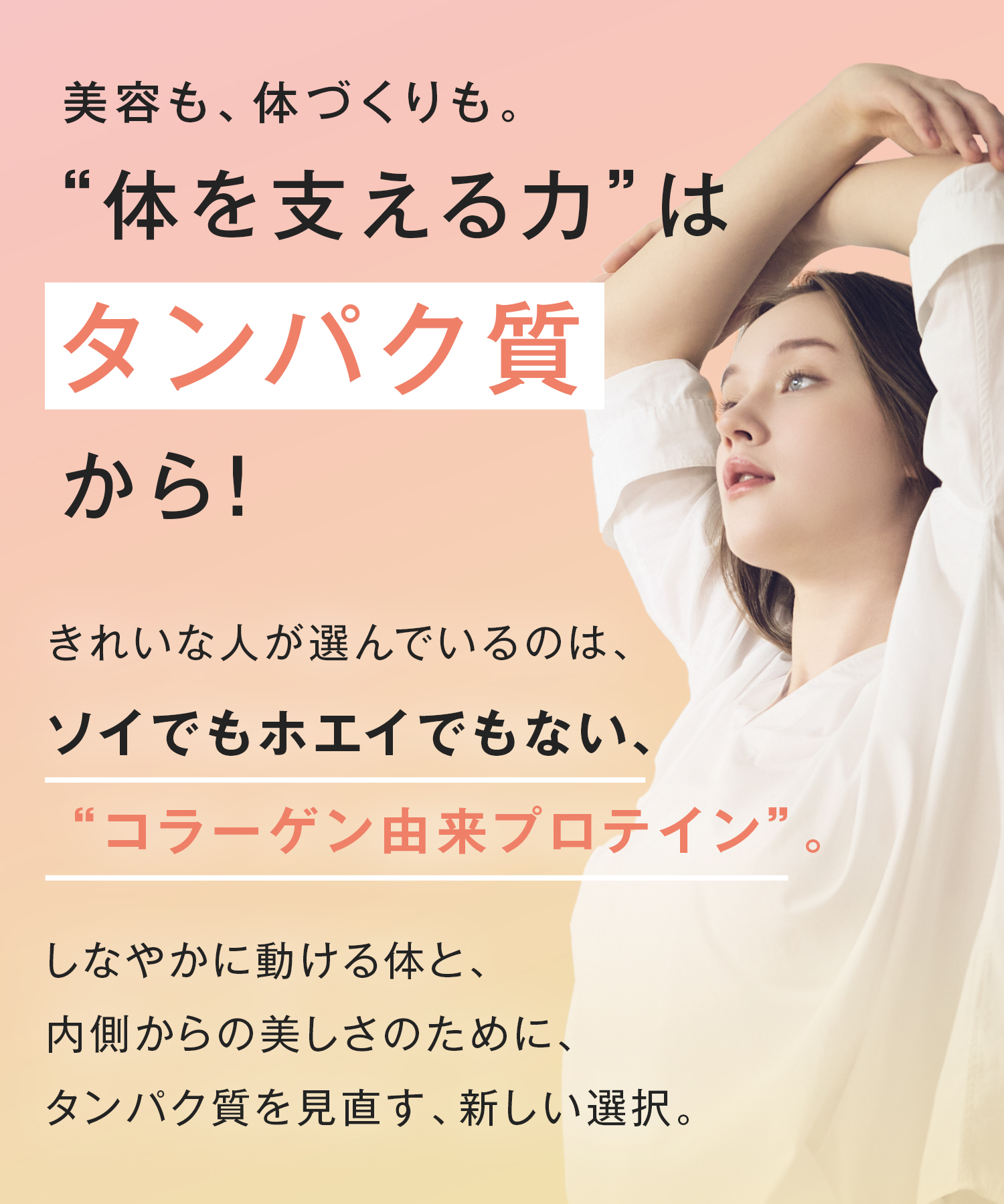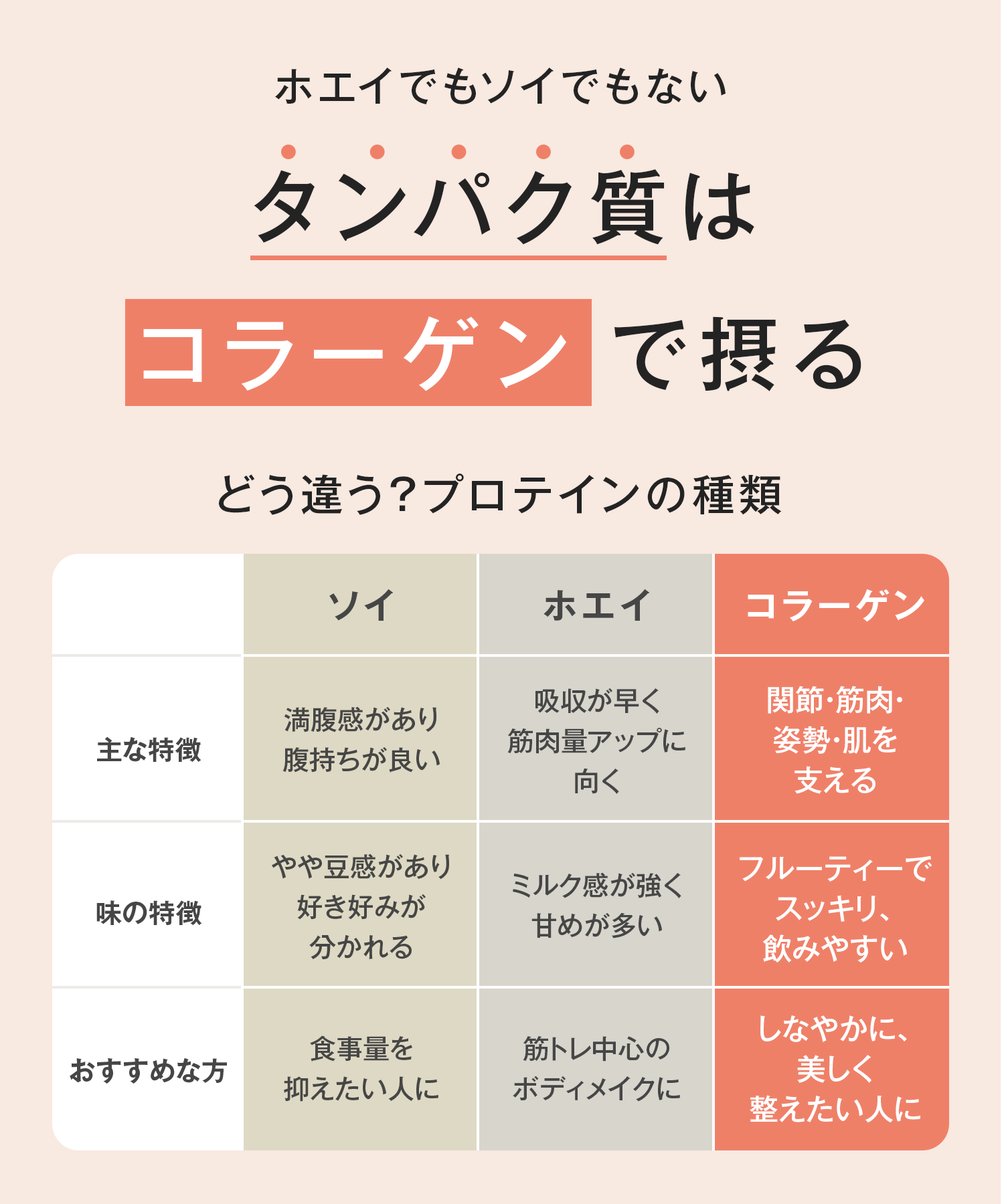 | 商品説明 | 1回分でタンパク質10.5g摂取 そのうち90%がコラーゲン由来 12種の栄養機能食品&9種のミネラル&3種の美容成分を配合 さらに人工着色料・保存料フリーな安心設計 1杯あたり53.55kcal コラーゲンベースのプロテインのため、サッと溶けてフルーツ系のサッパリとした味わいを楽しめる |