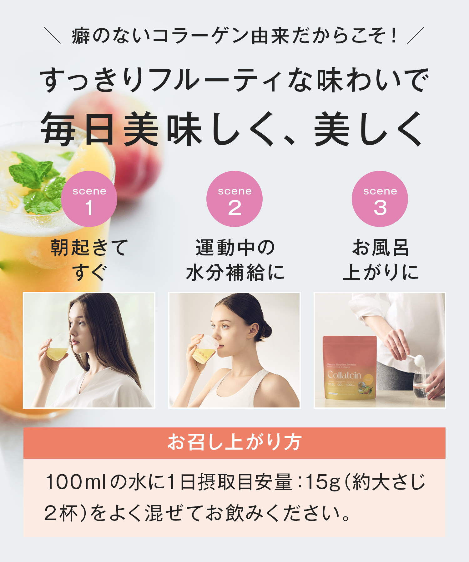 100mlの水に1日摂取目安量:15g(約大さじ2杯)をよく混ぜてお飲みください。 ※混ざりにくい場合はシェイカーなどもご使用いただけます。 【おすすめアレンジレシピ】 豆乳100ml 無糖ヨーグルト200g 牛乳100ml 上記にそれぞれ1日摂取目安量:15g(約大さじ2杯)を入れてよく混ぜる |