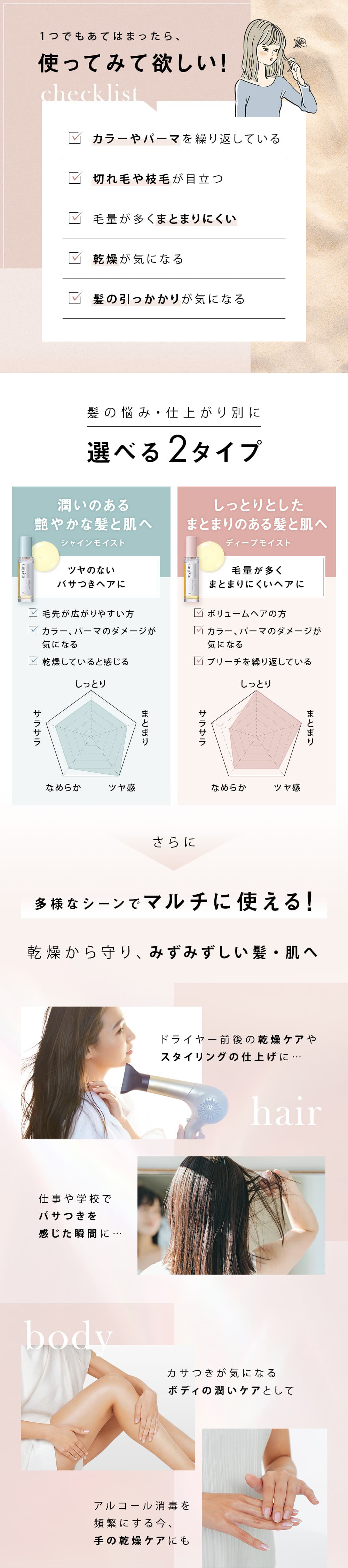 | 使用方法 | 仕上げの際、毛先になじませスタイリングしてください。アウトバスオイルとしてご使用の場合はタオルドライした髪や乾いた髪に、適量を手のひらでよく伸ばし、毛先を中心に髪全体になじませてください。お肌にご使用の場合は適量をよくなじませてお使いください。 |