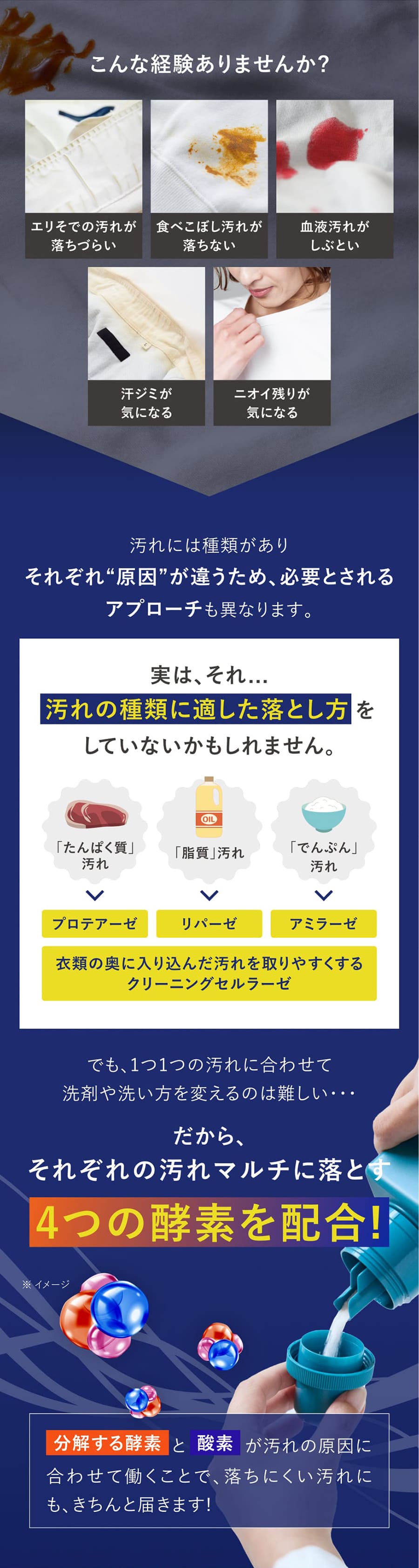 | 成分 | 過炭酸ナトリウム(酸素系)、界面活性剤(ポリオキシエチレンアルキルエーテル)、アルカリ剤(炭酸塩)、工程剤(硫酸塩)、水軟化剤、酵素、消臭剤、香料 |