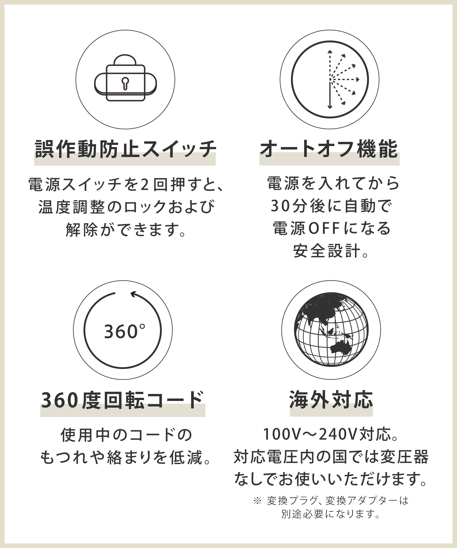 | 機能 | 完全セパレート仕様 ストレート&カール1タッチ切替可能 オートパワーOFF 開閉ロック機能 デジタル表示 360℃回転コード 海外対応電圧 |