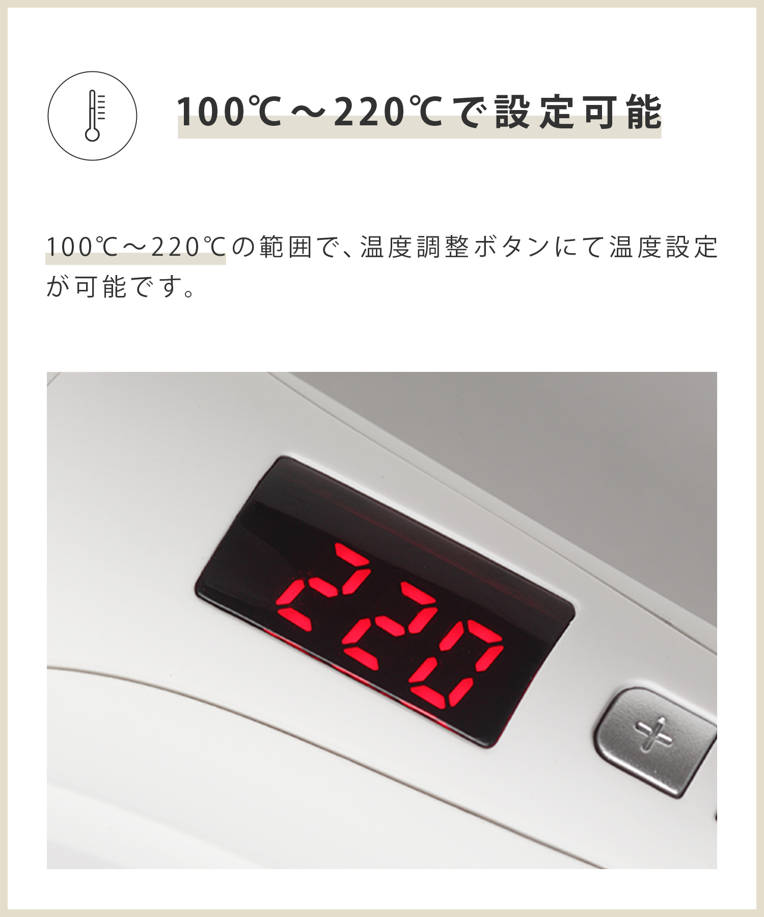| プレート温度 | 100℃〜220℃ (ボタン式5℃刻み調節) |