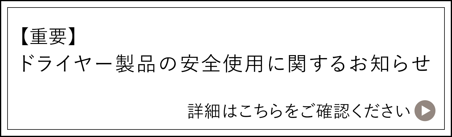| 使用上の注意 | ・電源コードに負担がかからない状態でご使用ください。電源コードは余裕をもって使用し、引っ張ったり、ねじったりしないでください。電源コードが断線し、火災・感電・やけど・ショートの原因となります。 ・使用中、吸込口から髪を10cm以上離してください。髪が吸い込まれ、髪が切れたり、やけど・故障の原因となります。 ・使用の際は、同じ箇所に長時間あて続けないようにしてください。髪を傷める原因となります。 ・使用後は電源がOFFになっていることを確認し、必ずコンセントから電源プラグを抜いてください。 ・本体は保管方法に従って保管してください。誤った方法で保管すると、電源コードが断線し、火災・感電・やけど・ショートの原因となります。 ・水洗いは絶対にしないでください。故障の原因となります。 ・アルコール、ベンジン、除光液などを使用しないでください。故障や部品の破損、変色などの原因となります。 ・整髪料などの汚れが付着したまま放置しないでください。変色したり、故障の原因となります。 ・ヘアピンなど他のものと一緒に保管しないでください。本体内部に入り込んだ場合、故障の原因となります。 ※詳細は取扱説明書をご確認ください |