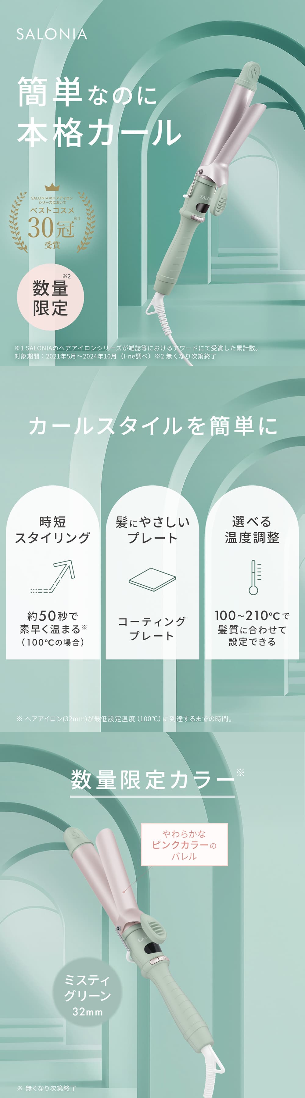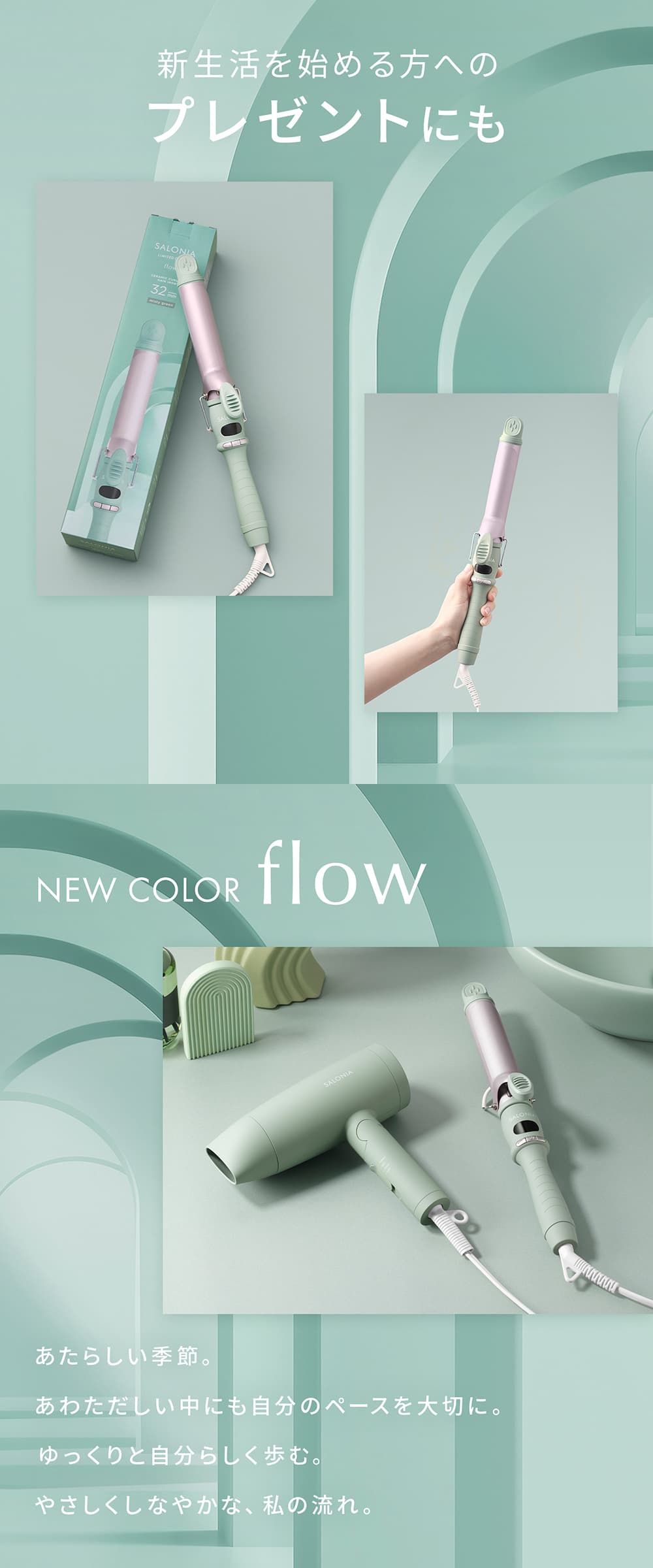 | 商品名 | サロニア セラミックカールヘアアイロン フロー ミスティグリーン 32mm |