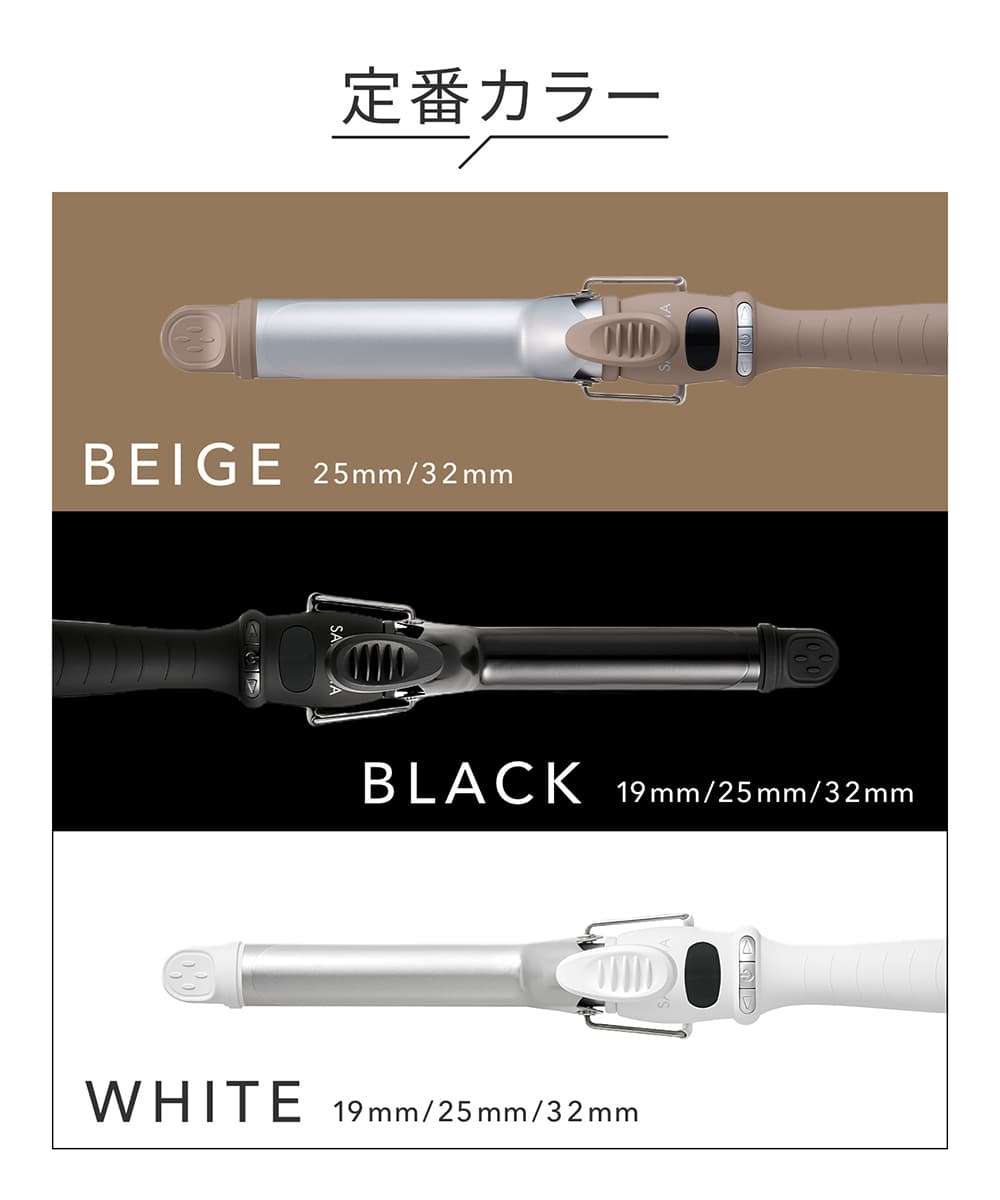| 使用上の注意 | 使用の際は、同じ箇所に長時間当て続けないようにしてください。髪を傷める原因となります。 ・過度に濡れた髪には使用しないでください。やけど・髪を傷める原因となります。 ・使用後はバレル部分や本体が大変高温です。直接触れたりしないでください。やけどの原因となります。 ・180℃以上で使用する場合、髪質によっては焦げたり煙が出たりすることがあります。その場合は温度を下げて使用してください。 ・使用後は電源がOFFになっていることを確認し、必ずコンセントから電源プラグを抜いてください。 ※詳細は取扱説明書をご確認ください |