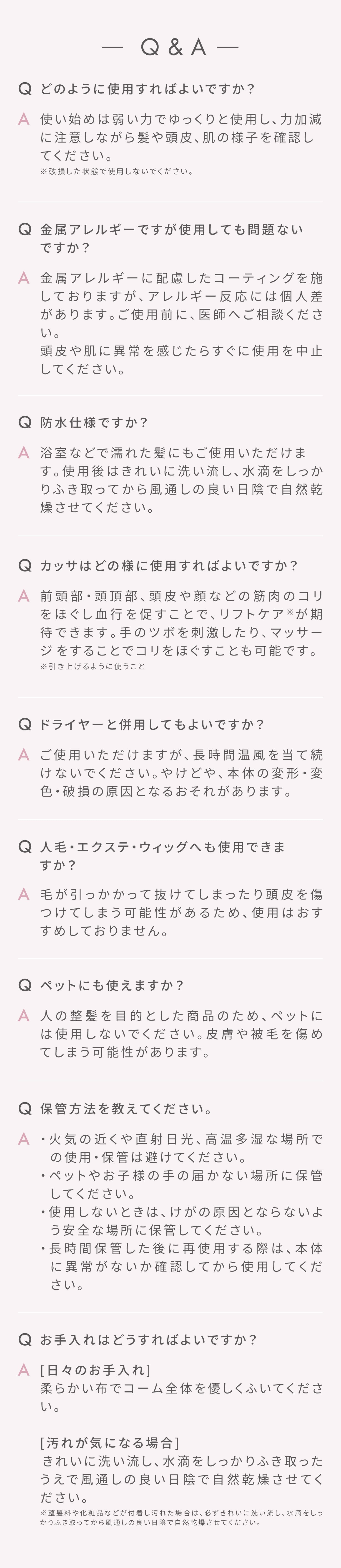 | 使用上の注意 | ・破損した状態で使用しないでください。 ・頭皮や肌に異常を感じたらすぐに使用を中止してください。 ・身体の不自由な方のみや、小さなお子様のみで使用しないでください。 また、ペットやお子様の手の届かないところに保管してください。 ・長時間温風をあてたり、整髪料や化粧品などを直接コームにつけないでください。 また、火気の近く、直射日光、高温多湿な場所での使用・保管はしないでください。変形や変色、破損のおそれがあります。 ・整髪料や化粧品が付着し汚れた場合や、浴室で使用された場合は、きれいに洗い流し、水滴をしっかりふき取ってから風通しの良い日陰で自然乾燥させてください。 ・本商品をシンナー・ベンジン・アルコール・除光液などでふかないでください。変形・変質・変色する可能性があります。 ・コーム歯の先端がとがっているため、目にあたらないよう注意してください。 ・廃棄の際は各地方自治体の廃棄区分に従ってください。 ※詳細は取扱説明書をご確認ください |