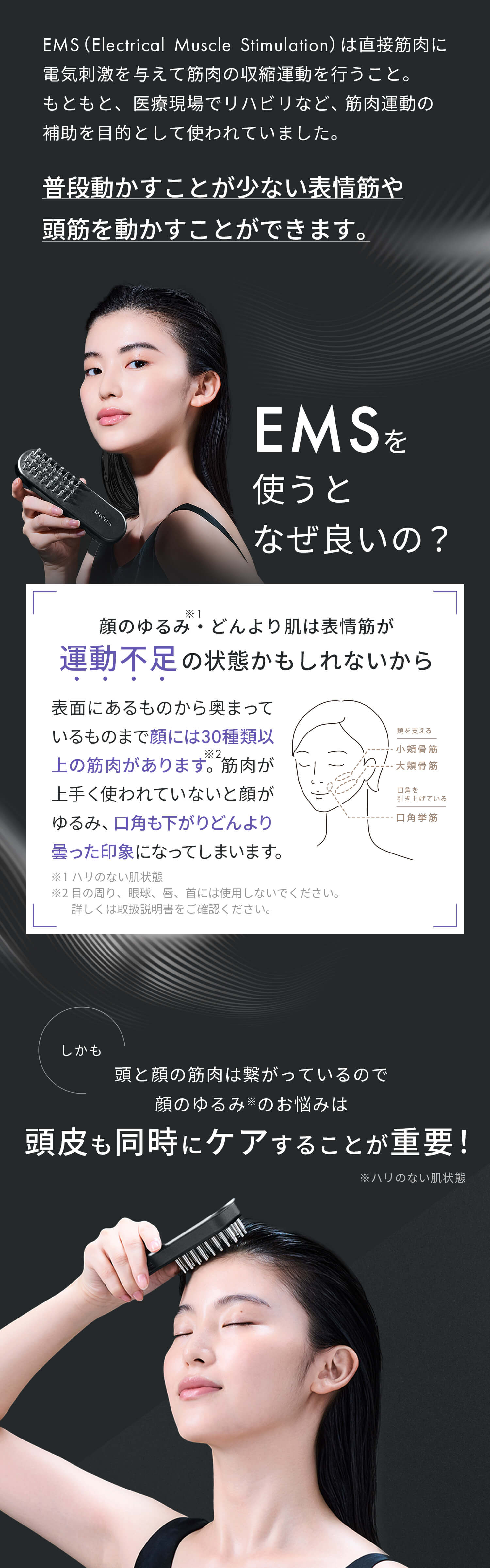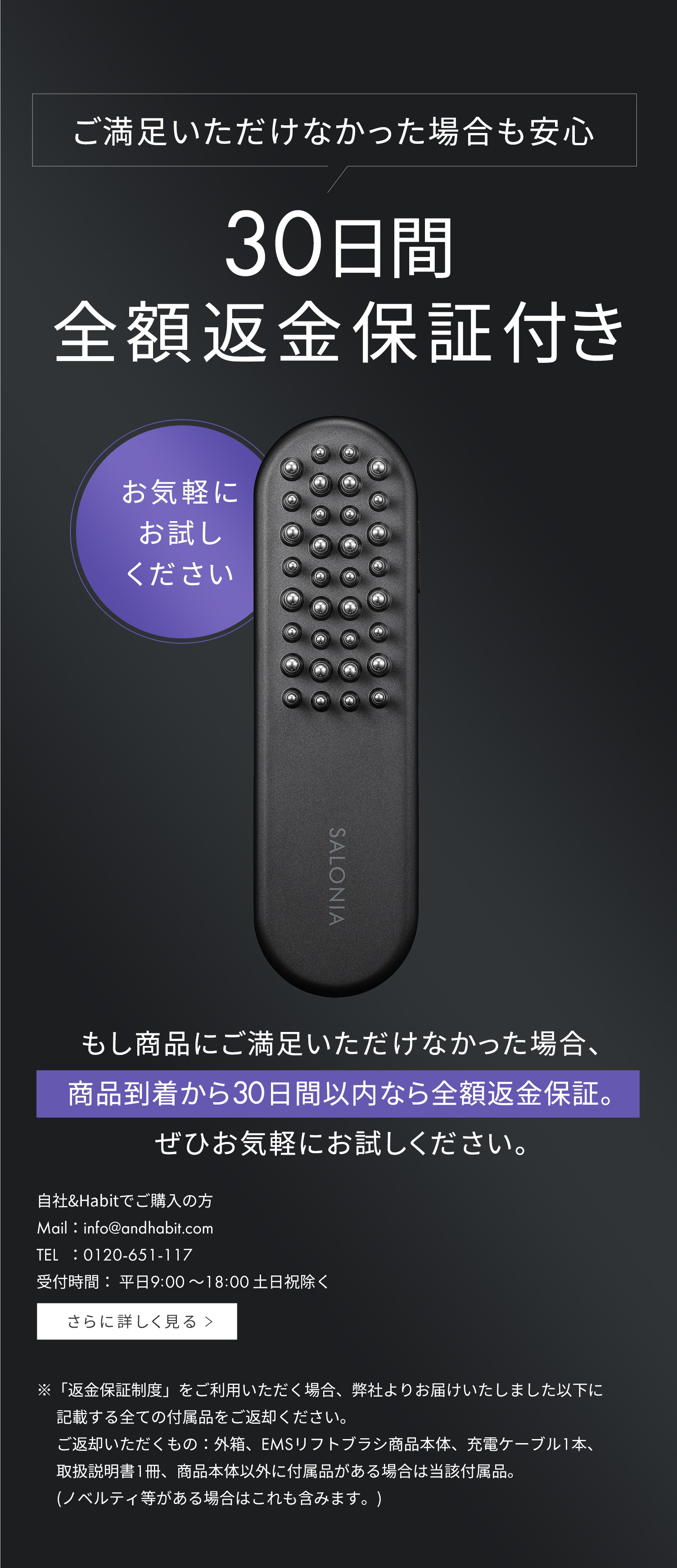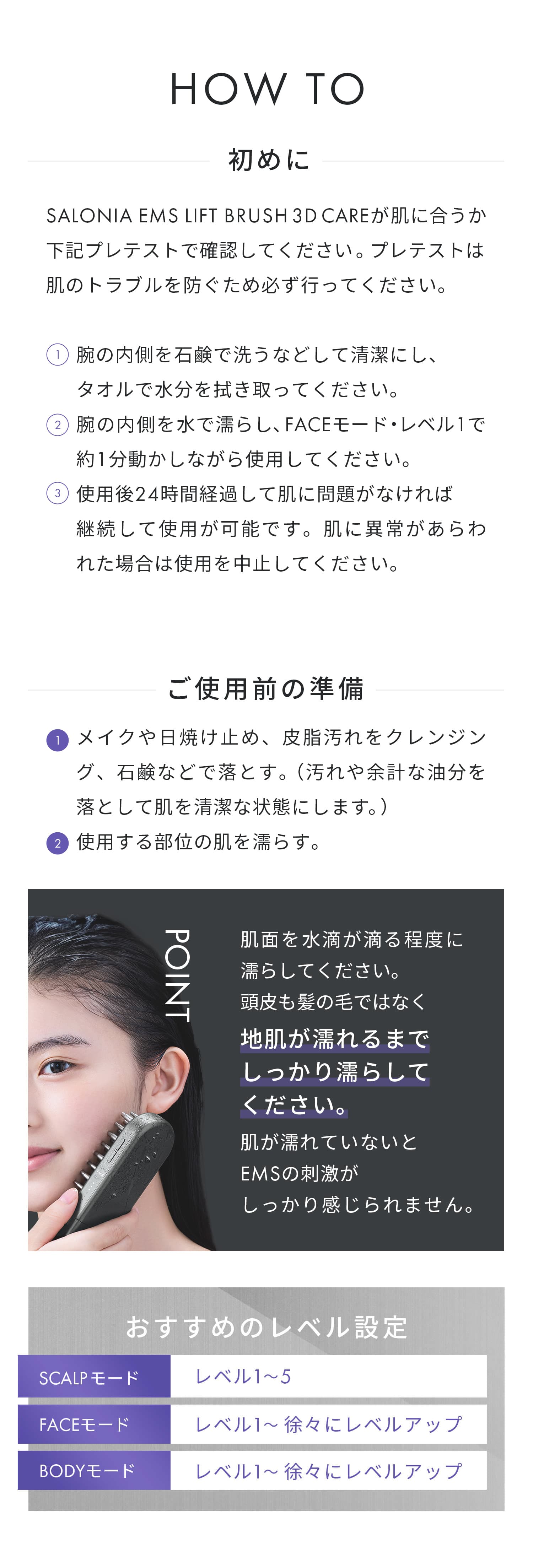 使用する場合は、一日置きに一日一回のペースでお使いください。 【プレテスト】 SALONIA EMS LIFT BRUSH 3D CAREが肌に合うか確認してください。プレテストは肌のトラブルを防ぐため、必ず行ってください。 1.腕の内側を石鹸で洗うなどして清潔にしてください。 2. 腕の内側を水で濡らし、FACEモード・レベル1で約1分動かしながら使用してください。 3. 使用後24時間経過して肌に問題がなければ継続して使用が可能です。肌にトラブルが見られる場合は使用を中止してください。 【使い方】 注意:使用後は必ず本体とピンをお手入れしてください。また、浴室など湿気の多い場所に放置しないでください。濡れた状態で放置すると本体の故障、腐食の原因となります。 ①メイクや日焼け止め、皮脂汚れを石鹸などで落とす。(汚れや余計な油分を落としてお肌を清潔な状態にします。) ②使用する部位のお肌を濡らす。 注意:シャンプーやトリートメント、ボディーソープを使わない。 ・頭皮:水や頭皮用化粧水・頭皮用ローションなど ・お肌:水や化粧水、ジェルなど ※お肌を濡らす程度目安:肌面を水滴が滴る程度(頭皮も髪の毛ではなくお肌が濡れた状態を基準とします。) ※その他化粧品(使用に適さないもの)や水以外使用しないでください。 <使用に適さない化粧品>・粘性の強い化粧水・オイル・スクラブ系・刺激の強い化粧水・ボディーソープ・シャンプー・温感効果のある化粧水、マッサージジェル・脂肪燃焼成分を含む化粧水等 ③電源・モードボタンを2秒以上長押しする。 ④EMSのモードを選ぶ 電源・モードボタンを短押ししてモードを選択してください。 ⑤EMSのレベルを選ぶ レベル切替ボタンを短押ししてレベルを選択してください。 レベルボタンを長押しするとレベル1に戻ります。 ※初めて又は時間を空けて使用する場合は必ずレベル1の状態で開始し、一か所の肌に5秒以上当てて体感を確認しながら徐々に好みのレベルに調整してください。 ⑥矢印に沿って、各部位ケアを行ってください。 注意:水の中に落とさない。水の中に沈めない。 <SCALP モード> ポイント:ブラシをジグザグと動かしながら髪の毛をかき分けます。ピン全体が頭皮と直接触れる事でEMSを感じられます。 STEP1:6回程度、ピン先をゆっくりと押し込む STEP2:矢印に沿ってブラッシング <FACEモード> フェイスラインなど矢印に沿って動かす 使用できない部位:まぶた、目のまわり、首のまわり おすすめの使用シーン:肌を十分に濡らしてください。EMSが感じやすくなるため必ずレベル1からご使用ください。 スチーマー(別売り)のスチームを浴びながら お風呂でリラックスしながら(水に沈めたり、落としたりしないでください。) 注意:シャンプーやトリートメント、ボディーソープを使わない。 <BODYモード> 気になる部位 (レベル1~刺激感覚に合わせて調整)を矢印に沿って動かす 使用できない部位:首のまわり、胸部、デリケートな部位 ※お腹や足に使う場合は、1部位10分以内にケアを完了させてください。 ※胸部やデリケート部位、取扱説明書のP3に記載している部位には絶対に使わないでください。 ※頭皮、顔のケアは1回あたり5~10分以内にケアを完了させてください。 ピン全体をしっかりフィットさせて動かすことでEMSを感じやすくなります。 ⑦使い終わったら必ず電源・モードボタンを2秒以上長押しをして、電源をオフしてください。 |