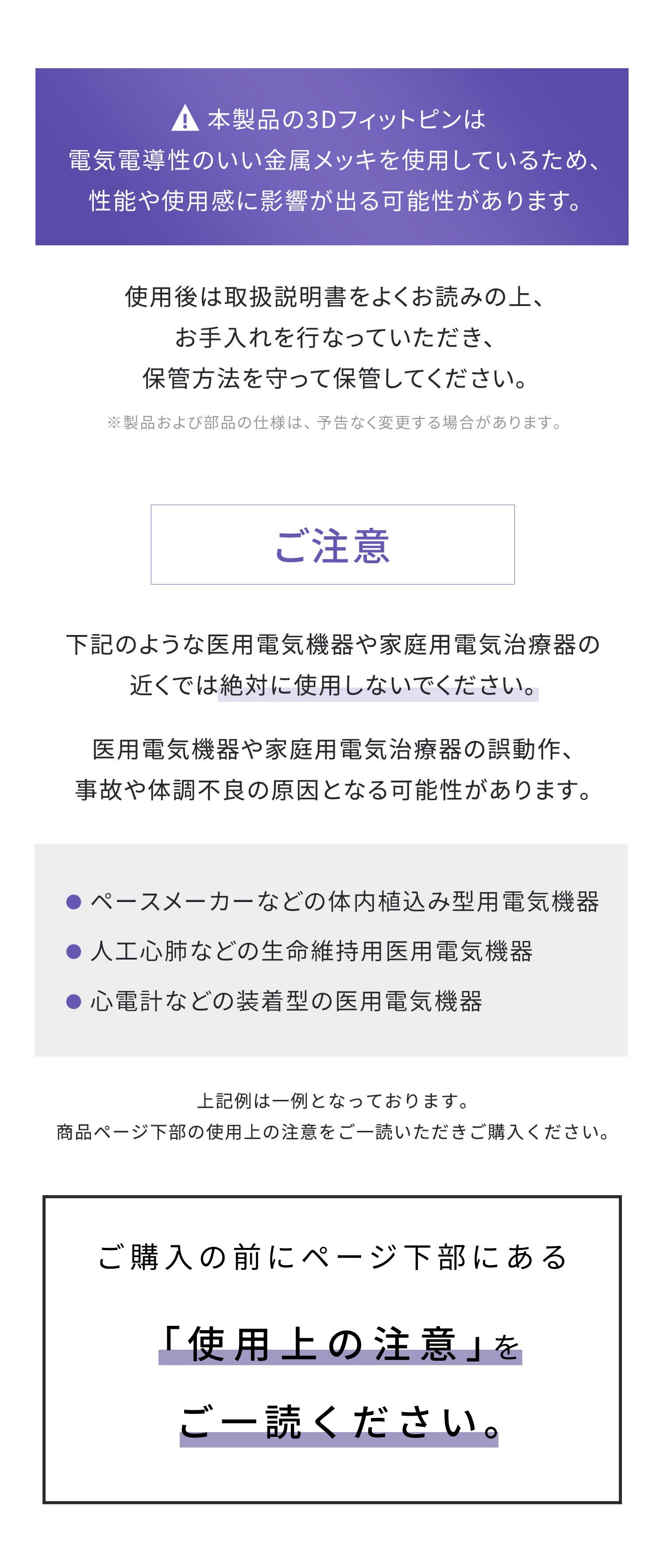 ・初めて使用する場合や長期間不使用など使い方に慣れるまでは必ずプレテストを必ず行ってください。 ・常に肌の様子を見ながらご使用ください。 ※使用中、肌にトラブルが出た場合は使用を中止して医師にご相談ください。 【危険】 下記のような医用電気機器や家庭用電気治療器の近くでは絶対に使用しない。 (医用電気機器や家庭用電気治療器の誤動作、事故や体調不良の原因) ●ペースメーカーなどの体内植込み型医用電気機器 ●人工心肺などの生命維持用医用電気機器 ●心電計などの装着型の医用電気機器 【警告】 次の症状に該当する方は使用しない。 (事故や体調不良、失明の原因になる可能性) ●持病のある方(心臓疾患、高血圧、糖尿病など) ●ステロイド系ホルモン剤の長期使用や肝機能障害で毛細血管拡張を起こしている方 ●交通事故などで頭部・眼科的後遺症がある方 (肌や身体のトラブルの原因になる可能性) ●アレルギー体質の方 ●皮膚疾患のある方 (ホルモンバランスが不安定なため肌トラブルの原因になる可能性) ●妊娠初期の不安定期から出産直後(授乳中)までの方 (やけど・感電・けがの原因になる可能性) ●温度や刺激の感覚が自覚できない方 ●幼児や成長期の子供、および自分で意思表示のできない方 上記例は一例となっていて、使用を控えていただきたい方・医師にご相談のうえご使用いただきたい方・使用禁止部位を記載しておりますので、ホームページまたは取り扱い説明書に記載してあります。そちらを要確認ください。 >>詳しくはこちら また、安全に製品をご使用いただけますよう、以下の注意事項をよくお読みいただき、正しくご使用いただけますようお願い申し上げます。 >>詳しくはこちら |
