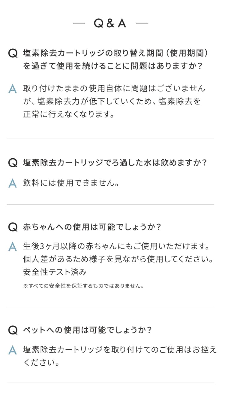 ◇飲用には使用しないでください。肌や身体のトラブルの原因になる可能性があります。 ◇カートリッジを分解したり中身を取り出さないでください。 ◇一般家庭水道水以外の水には使用しないでください。(温泉水、井戸水など) ◇故障や目詰まりの原因になるため、近隣で水道工事が行われていて赤水などが出ているときは使用しないでください。 ◇直射日光のあたる場所、極端に低温または高温多湿の場所、乳幼児の手の届く所には保管しないでください。 ◇開封後はお早めにお使いください。 |