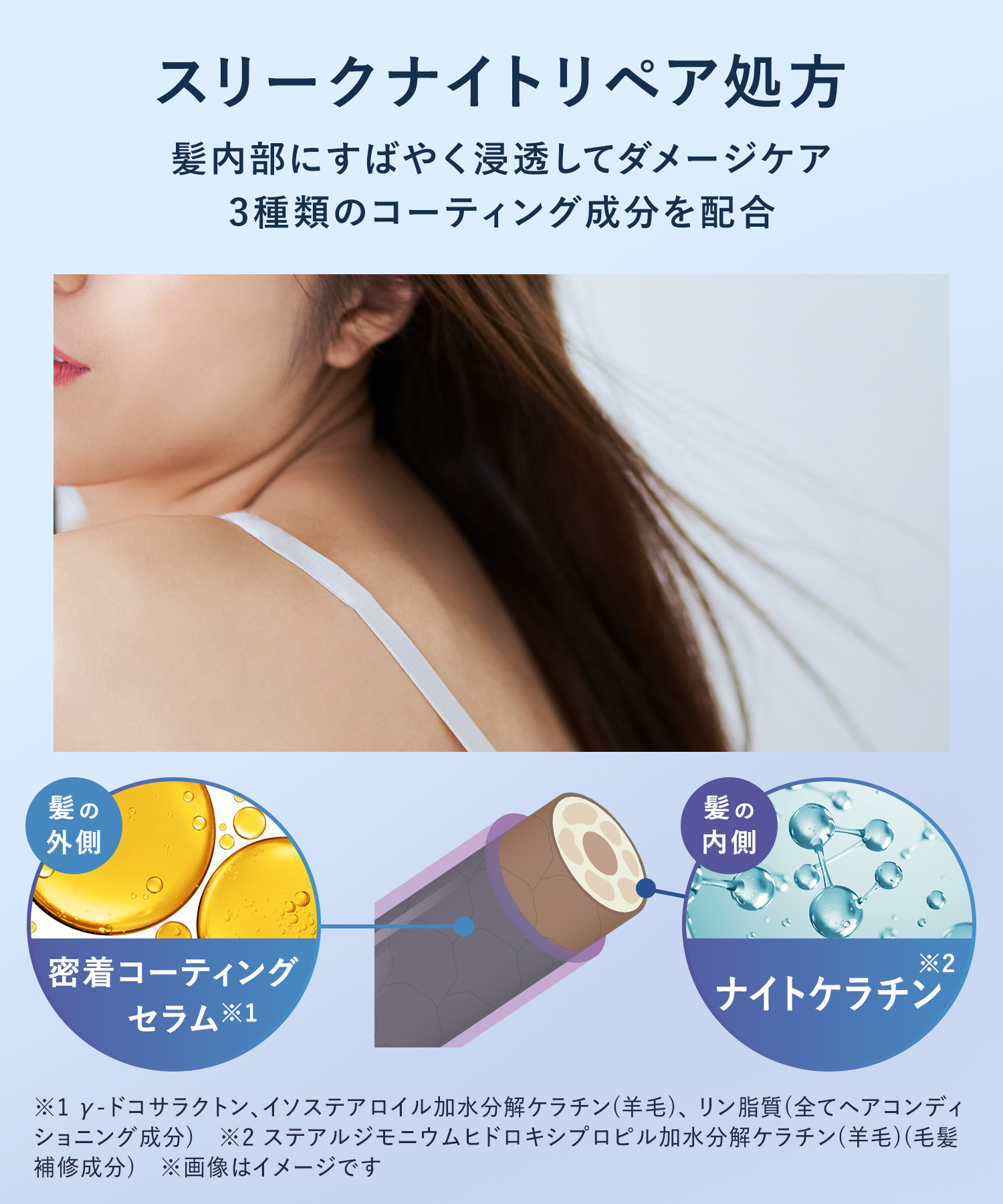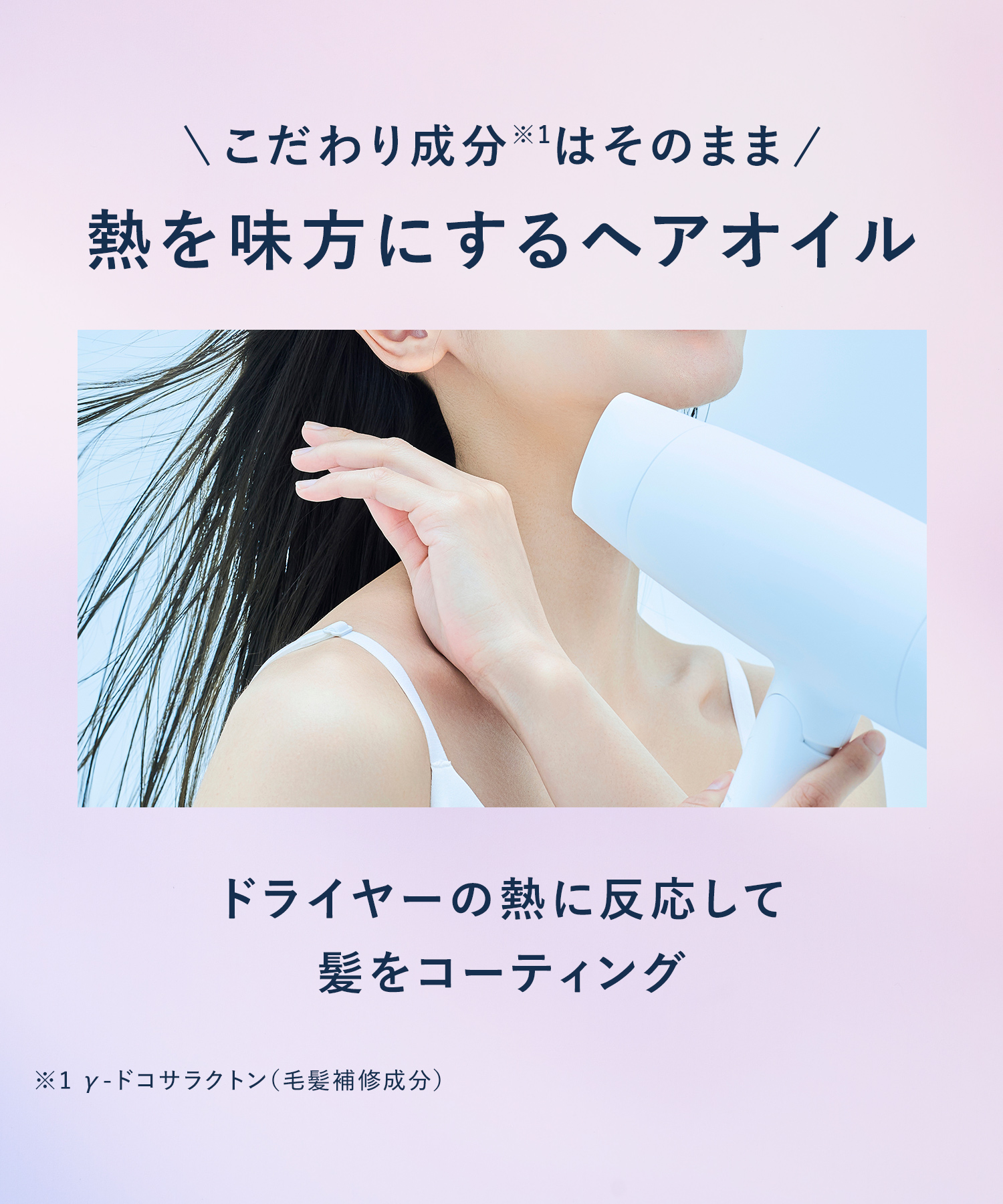 | 成分 | パルミチン酸エチルヘキシル、ジメチコン、イソノナン酸イソノニル、ヒマワリ種子油、ポリクオタニウム-61、スクワラン、γ-ドコサラクトン、ステアルジモニウムヒドロキシプロピル加水分解ケラチン(羊毛)、イソステアロイル加水分解ケラチン(羊毛)、セテアラミド エチルジエトニウムサクシノイル加水分解エンドウタンパク、加水分解ケラチン(カシミヤヤギ)、ネムノキ樹皮エキス、チャボトケイソウエキス、ゼニアオイ花エキス、オオヤマザクラ果実エキス、フルセラリアルムブリカリスエキス、イソステアリン酸ポリグリセリル-2 、リン脂質、ゼイン、フィトステロールズ、マカデミアナッツ脂肪酸フィトステリル、シクロヘキサン−1,4−ジカルボン酸ビスエトキシジグリコール、ダイズ油、BG、トリ(カプリル酸/カプリン酸)グリセリル、DPG、グリセリン、プロパンジオール、トコフェロール、水、香料 |