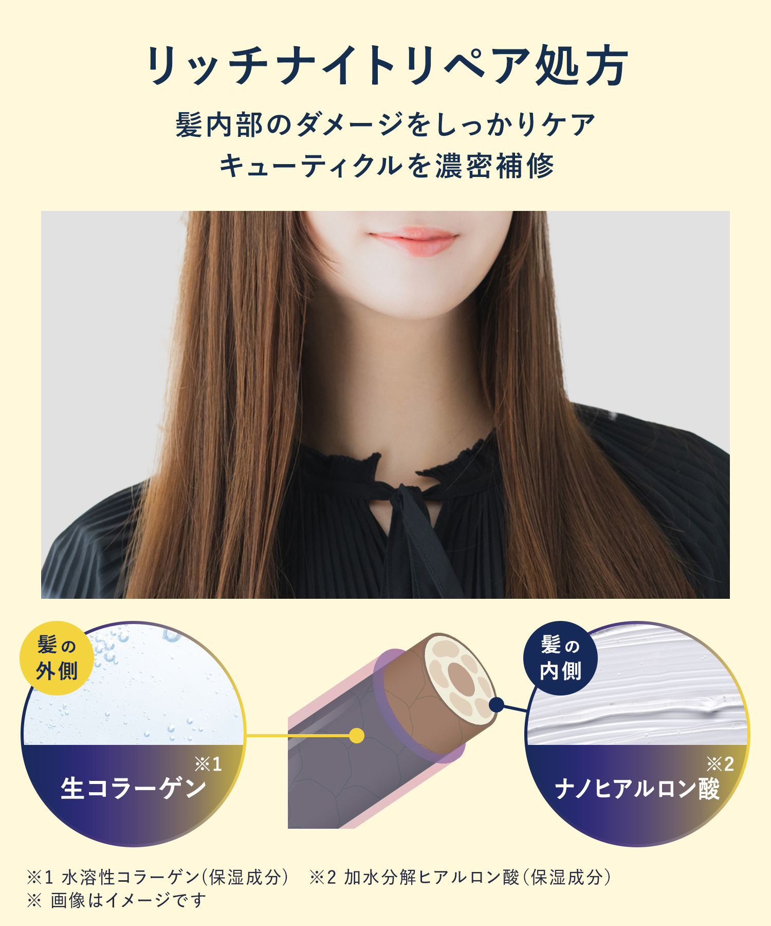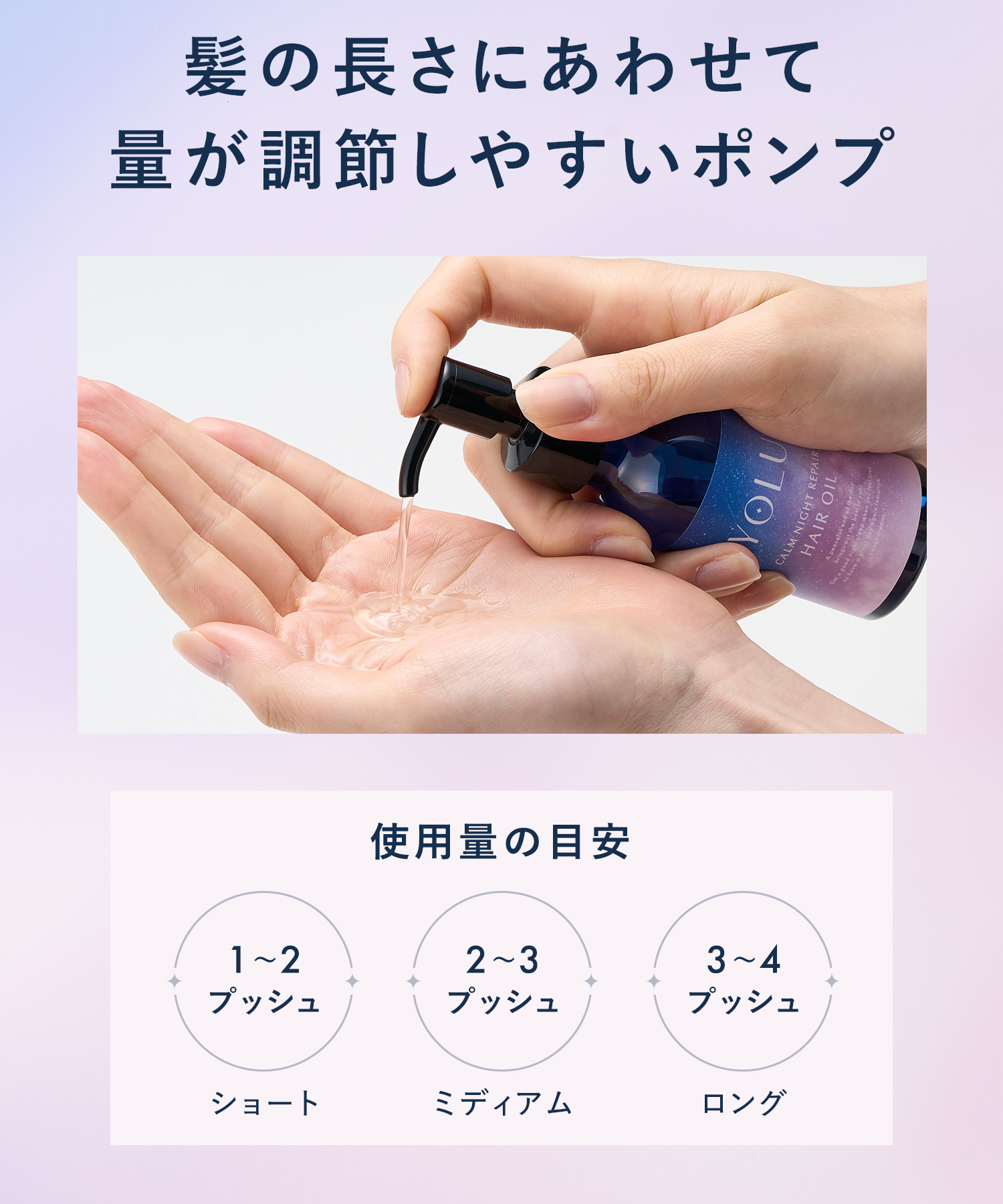 | 使用方法 | タオルドライした髪や乾いた髪に、適量を手のひらでよく伸ばし、毛先を中心に髪全体になじませてください。(洗い流す必要はあり ません。) |