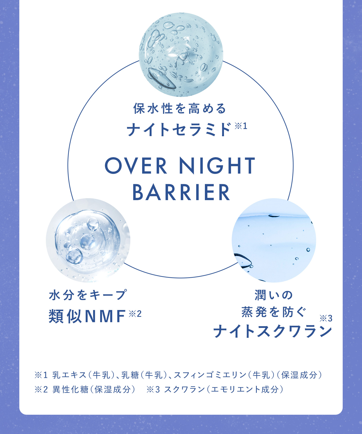 | 成分 | 水、BG、ミネラルオイル、グリセリン、パルミチン酸エチルヘキシル、ステアリン酸グリセリル(SE)、水添ナタネ油アルコール、ポリソルベート60、異性化糖、乳エキス(牛乳)、乳糖(牛乳)、スフィンゴミエリン(牛乳)、スクワラン、加水分解コラーゲン、ナイアシンアミ ド、月見草油、ポリクオタニウム-51、ハス花エキス、ネムノキ樹皮エキス、チャボトケイソウエキス、アスペルギルス/ウワバミソウ珠芽発酵物、ワイルドタイムエキス、トウキンセンカ花エキス、ポリクオタニウム-61、オオヤマザクラ果実エキス、マカデミアナッツ 脂肪酸フィトステリル、アルギニン、プロパンジオール、フィチン酸、水酸化K、ポリアクリル酸Na、ココイルアルギニンエチルPCA、ジメチコン、カルボマー、キサンタンガム、酸化銀、フェノキシエタノール、香料 |