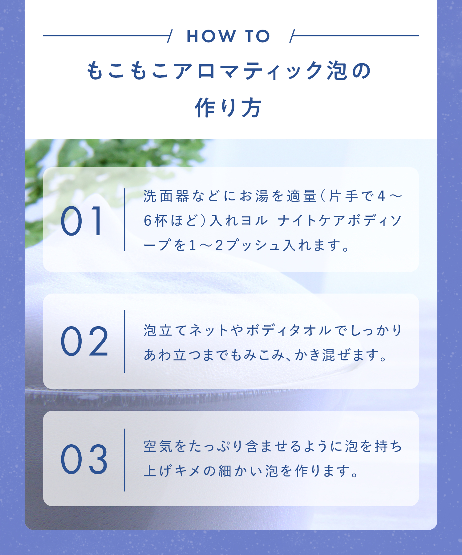 | 使用方法 | 手やタオル、泡立てネットなどをぬらし、適量をつけて泡立て、全身を洗ってください。洗浄後は十分洗い流してください。 |